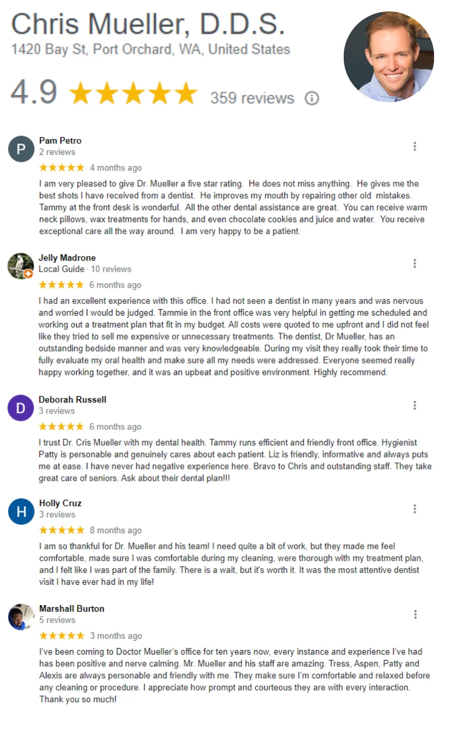 Dr. Chris Mueller has been treating those with complex dental and cosmetic needs in the Port Orchard, Washington, area for more than 17 years. He was profiled in a book entitled Playing Your ‘A' Game by Dr. Bill Blatchford and is considered one of the top 23 leaders in the field of dentistry.